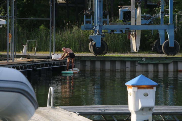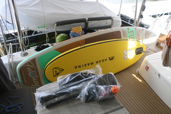 Abends geht es zunächst zur Demontage einiger Außenbordsdurchbrüche zu Elias auf die YSM. Der erste Einsatz des neuen SUPs! Habe ich doch keine Lust, um die ganze Bucht zu wandern, denn die Landplätze sind auf der anderen Seite des Hafens!