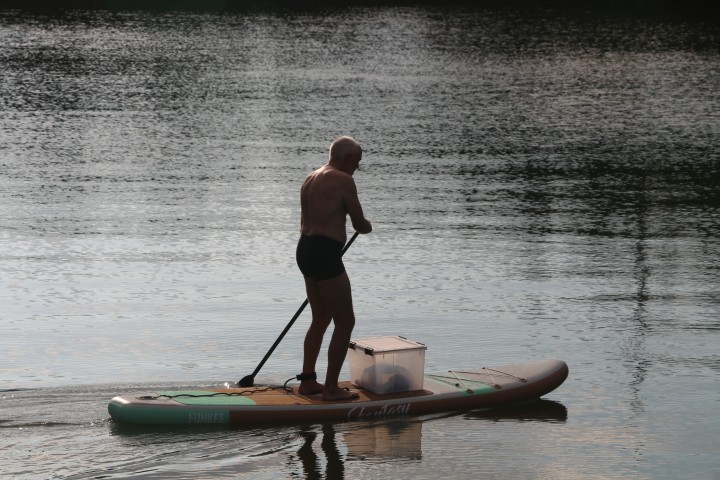 Es liegt schon länger da, heute wird es ausgepackt: Das Paket mit dem SUP (Stand Up Paddelboard). Wir haben ja ein kleines und gelernt, dass das ZU klein war. Das bekommt ein Schild „Für Kinder“ und wird verschenkt. Ich bin begeistert, was alles mit in dem Paket ist: Wie erwartet eine große Pumpe, die ich auch so für das Schlauchboot haben wollte. Aber auch noch ein Sitz und ein Doppelpaddel! Dazu noch eine wasserdichte Handy-Hülle! Wahnsinn