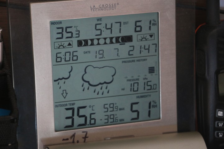 Nun ist die Zeit gekommen, der Hitze zu entfliehen. Über 35°, die Luftfeuchte deutlich mehr, als dieses Instrument anzeigt. Da ist die Klimaanlage schon sehr fein. Aber eben begrenzt auf den Schlafraum... Morgen kann es also endlich los gehen!