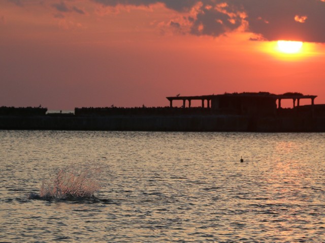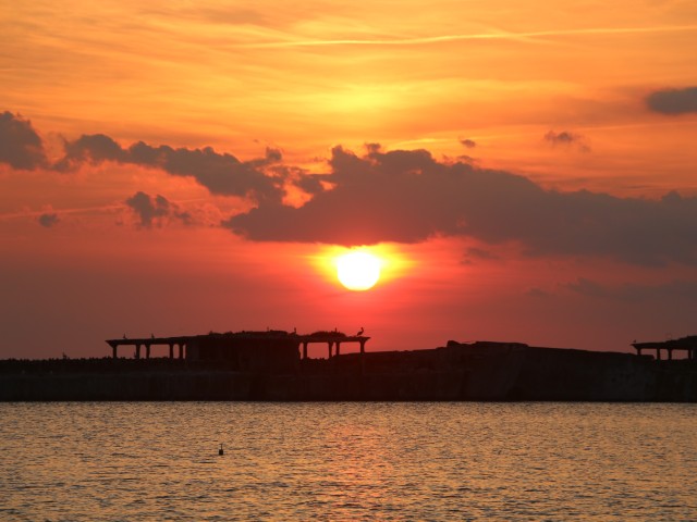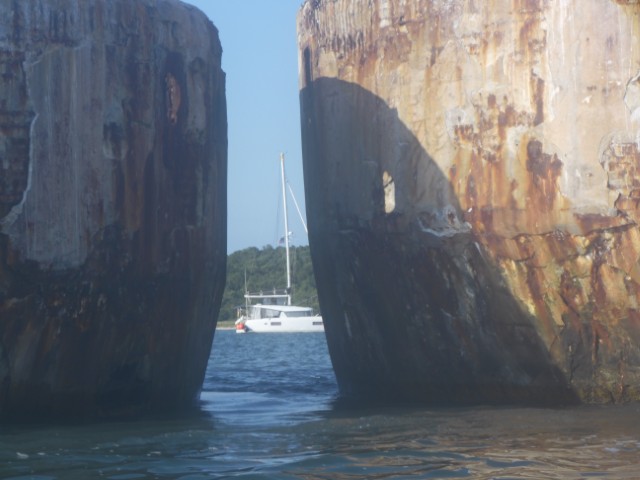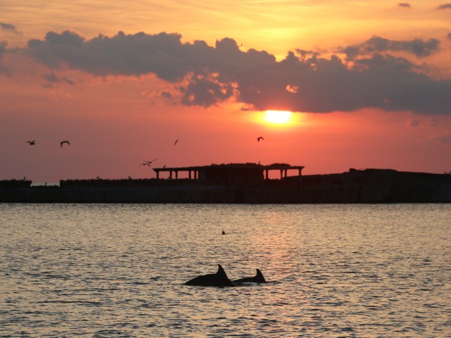 Diese bieten nicht nur Fischen einen gut geschützten Lebensraum, wie wir anhand der vielen Fischer um die Schiffe herum feststellen können, sondern auch zahlreichen Vögeln Nistgelegenheiten, wie wir nicht nur sehen, sondern auch riechen können. Diese Wracks sind schon faszinierend! Leider ist das Wasser zu schlammig als dass es sich zu schnorcheln lohnen würde. Gegen Abend bekommen wir dann noch Besuch von ein paar Delfinen, die wohl auch den Fischreichtum um die Schiffe zu schätzen wissen.