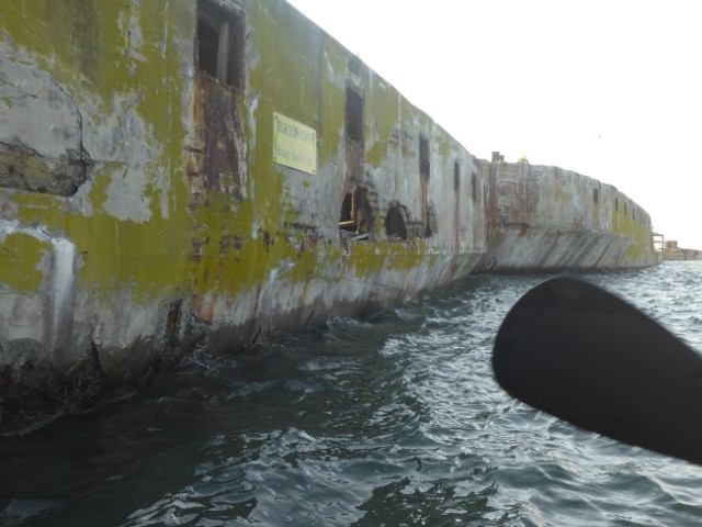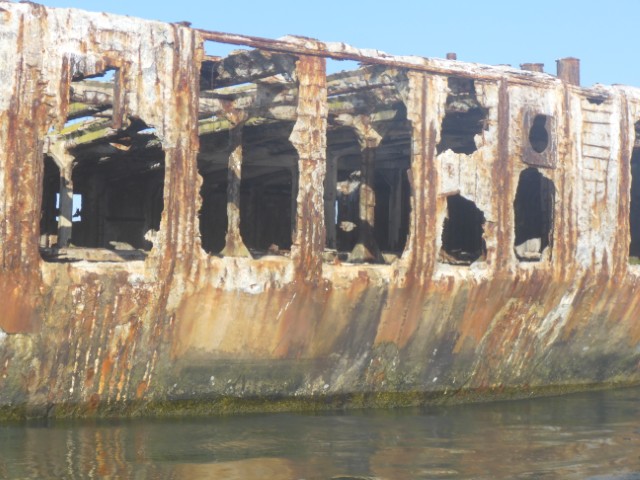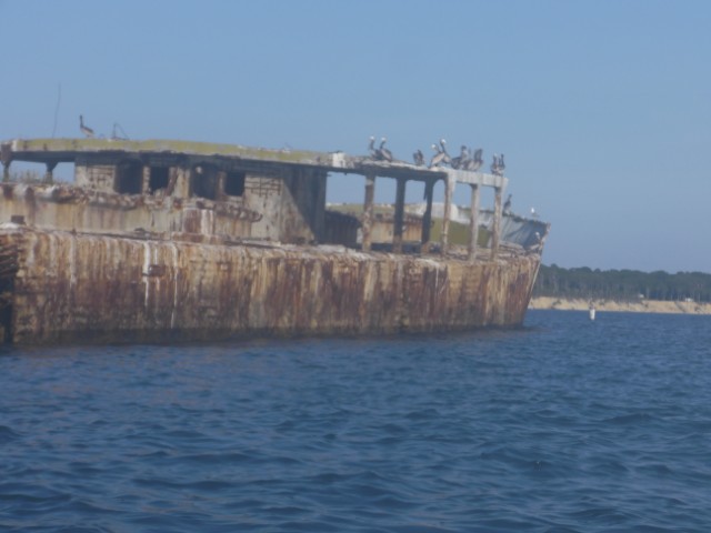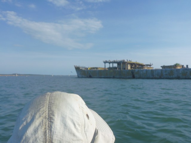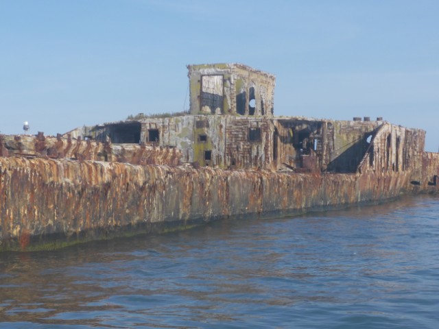 Dann kommen wir zu unseren Inselchen. Mit dem Fernglas sieht das ulkig aus. Da liegen jede Menge Schiffe davor – also eher doch nichts für uns. Allerdings sehen die schon eher wie Schiffsfriedhof aus. Naja, mal abwarten und etwas näher ran: Das sind tatsächlich Schiffwracks, aber schon etwas speziell: Es sind die Betonschiffe von Kiptopeke. Dort hatte die Virginia Ferry Commission 1949 einen Terminal für Autofähren errichtet. Und da es dort keinen natürlichen Hafen gab, kaufte sie 9 ca. 100 Meter lange, vom Krieg übrig gebliebene Frachtschiffe, und versenkte diese so, dass sie als Wellenbrecher für das Terminal dienen konnten.