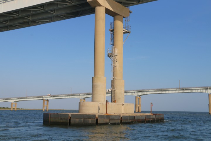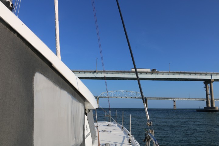Gleich anschließend geht es für uns raus – auf den Atlantik und dann endlich nach Norden! Anker auf, für ne gute halbe Stunde die Fock zum Motor dazu und dann unter der Brücke der Chesapeake Bridge-Tunnel durch. Das ist für mich das Ende der Chesapeake Bay und damit der Anfang vom Atlantik. Das letzte Mal sind wir im Dezember in der Nacht unter dieser Brücke durch gerutscht. Das ist heute deutlich entspannter…. Dafür aber der bange Blick von Michèle nach oben: Der Mast, also zumindest die UKW-Antenne kratzt doch an der Brücke!!??? Nein – da ist noch mindestens ein Meter Platz! Aber bei 22 Meter sind nur noch 3 Fuß Freiluft!