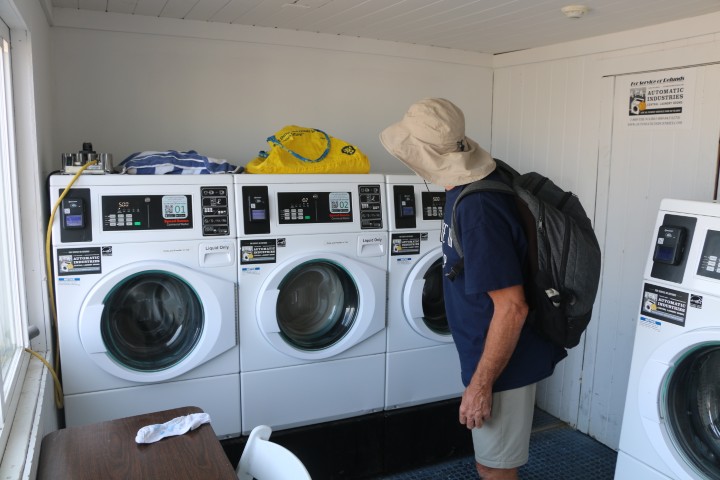 Ankern: Lake Montauk, Long Island, NY. Erst einmal Wäsche waschen – ist hier im kleinen „Hafenmeister-Türmchen“ unten mit 5 Maschinen einfach. Muss genutzt werden, die Chance!