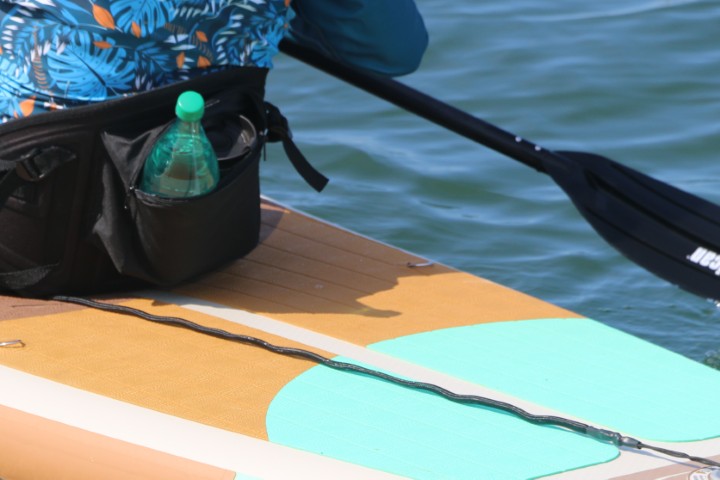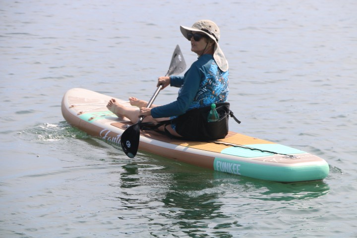 Und dann geht Michèle auf Langfahrt! Mit dem SUP – im Sitzen. Da hat sie ein Spaß dran! Man beachte auf dem Foto: Wasserflasche und – in schwarz nur schwer zu erkennen – einen Thermosbecher Kaffee.
