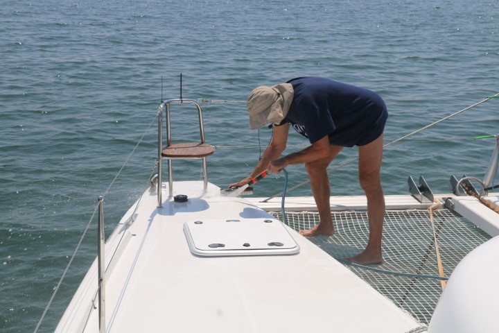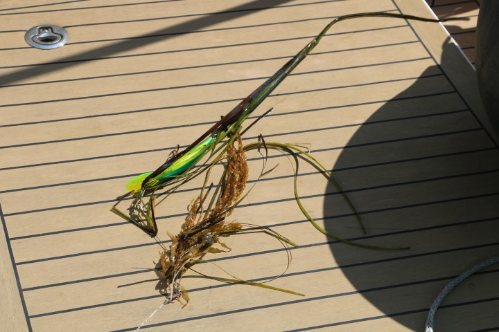 Gegen 13 Uhr ist der Anker aus dem Wasser. Großes Reinschiff des Vordecks mit Beseitigung all der Hinterlassenschaften der zweiflügeligen Kameraden in Weiß und dem ganzen Bewuchs, der die Kette und den Hahnepot dunkelgrün gemacht hatten.