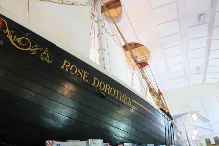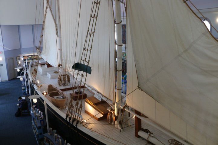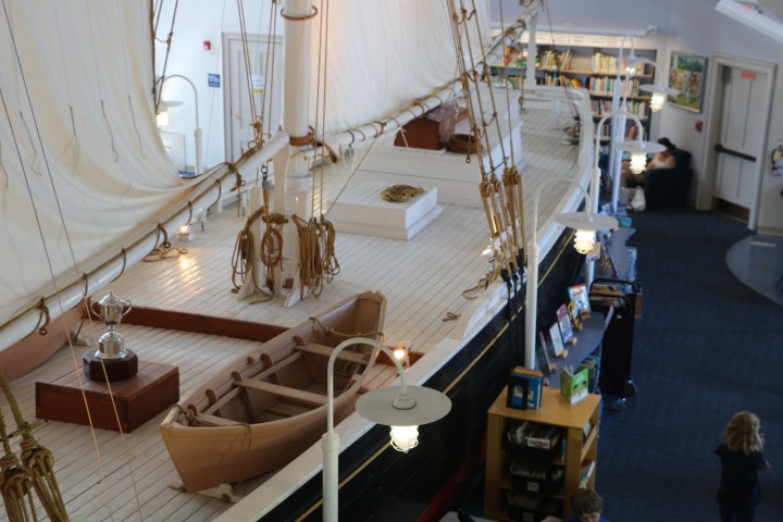 Die Library ist schön – und gut besucht. Kinder liegen auf dem Fußboden und lesen, in Ruhebereichen wird gelesen und gearbeitet. Und für uns das Herzstück: Das Modell der „Rose Dorothea“. Ja – das ist ein Modell! Mit rund 66 Fuß fast eineinhalb mal so groß wie RE! Über den Erbauer und die Geschichte hatte ich ja schon berichtet.