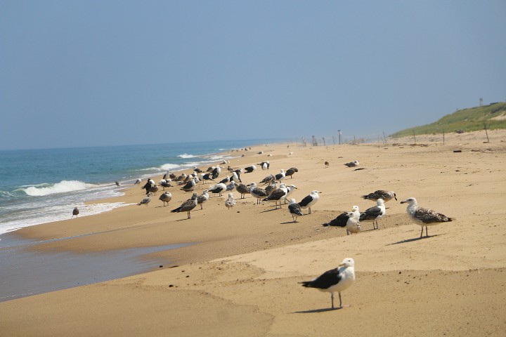 Im Bus sehen wir, dass die Infrastruktur für Fahrräder einen sehr guten Eindruck macht. Da wird man dann ja wohl auch gut wandern können. OK, angekommen. Vom Klohäuschen führt ein schöner Holzsteg bis zum Rettungshäuschen. Leider ist das dann aber das Ende des Weges und durch die Dünen sieht es auch noch nicht mal nach Trampelpfad aus. Also entscheide ich, dass wir am Strand lang zu den Strandhäuschen latschen. Ist bestimmt auch netter. Mit ein paar Seals, wie unser Busfahrer erwähnte; vielleicht sogar mit dem einen oder anderen Wal!