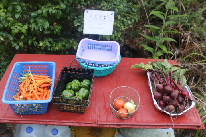 An der Straße ein kleiner Stand mit Gemüse von privat: Bitte bedienen Sie sich, aber lassen die Körbchen hier. Na – das werden wir auf dem Rückweg machen! (Das gibt dann morgen eine Kartoffel-Rote-Beete Pfanne!)