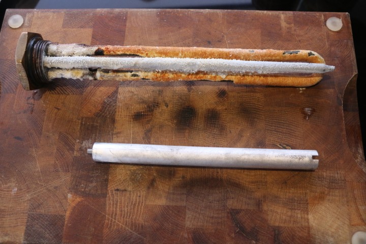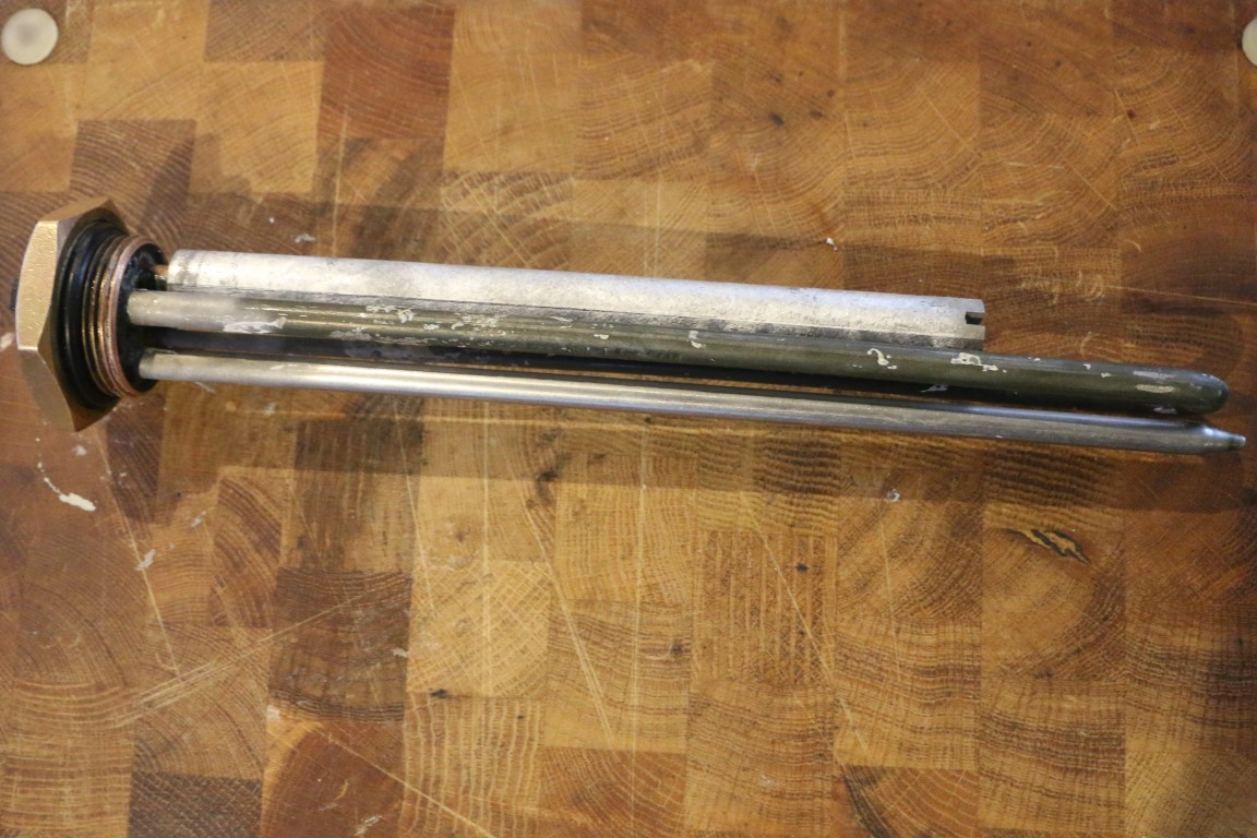 Über 2 Jahre ist die letzte Wartung her – und das ist definitiv zu lange gewesen. Die alte Anode ist komplett verschwunden, die Heizstäbe sind massiv bewachsen. Kalk kann das eigentlich nicht sein, ist unser Wasser doch so gut wie kalkfrei, da es aus dem Watermaker kommt. Ist das schlicht Magnesium von der Opferanode? Nun – das Ganze wird in Citronensäure gebadet. Und das dauert ein wenig. Über Nacht wäre wohl besser! Dann sieht alles wieder einigermaßen vorzeigbar aus und wird wieder eingebaut.