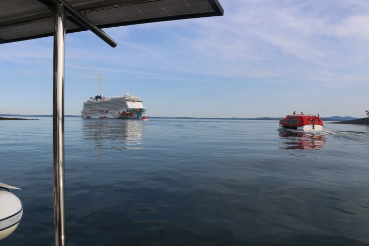 Wir werden wach: was ist das denn? Da liegt vor der „Einfahrt“ ein riesengroßer Kreuzfahrer. Will der hier vorbei? Na, Gott sei Dank nicht! Die Gäste werden von Wassertaxis sowie einer Fähre, welche jedes Mal, wenn sie an uns vorbeifährt, einmal hupt. Wahrscheinlich um ihre Unzufriedenheit kundzutun. Liegen wir doch ziemlich im Fahrwasser. Wobei selbst ich an uns vorbeikäme und so ein erfahrener Kapitän sollte damit eigentlich keine Probleme haben:
