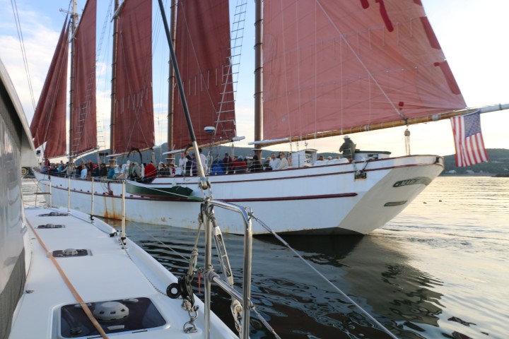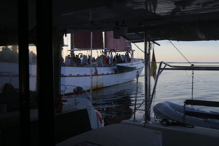 Abends muss auch der 4-Master seinen Unmut kundtun und streift nur einen knappen Meter an uns vorbei – gestern musste er mit seinen zahlenden Gästen ulkigerweise nicht hier durch fahren. (Da lagen wir schließlich auch noch an einer fremden Mooring und konnten SEINEN Unmut nicht erregen.)