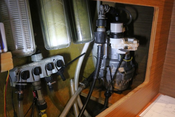 Klares Tagesziel: Die Watermaker Hochdruckpumpe ersetzen. Denn wenn da was nicht läuft, müssen wir auf Landversorgung mit dem Frischwasser umstellen. Und da haben wir ein Problem: Keine Transportkapazitäten. Also müssten wir Wasserkanister kaufen.