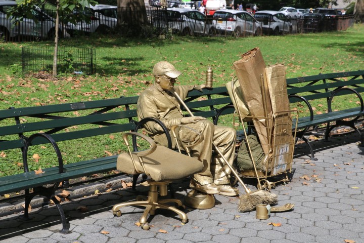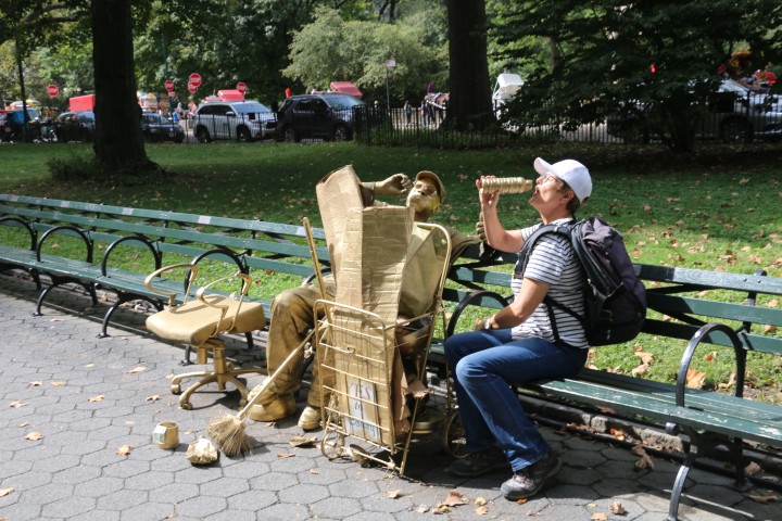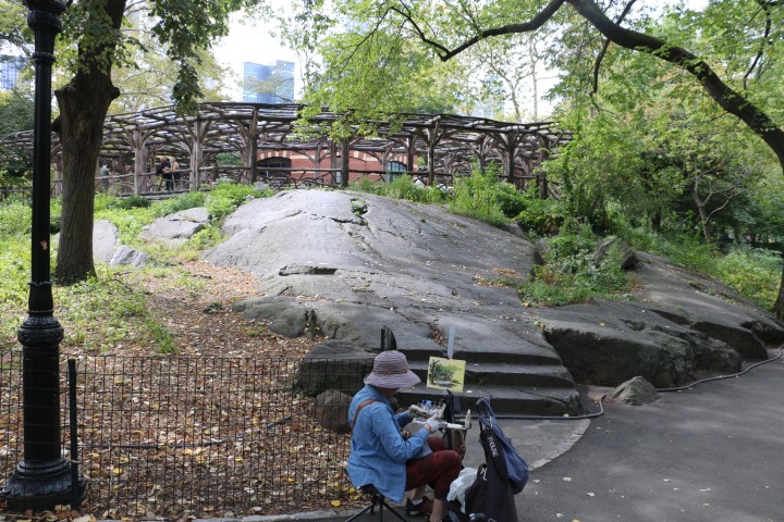 Erstes Ziel: Central Park. Also mit der U-Bahn noch 4 oder 5 Stationen. Orientieren, wo geht es lang? Mit Sonnenschein kann man jedenfalls grob die Himmelsrichtung abschätzen. Und dann für mich eine Überraschung: Ich hatte nicht erwartet im Zusammenhang mit NYC das Wort „schön“ zu benutzen. Aber es ist einfach schön. Ok – Masse Mensch. Aber gut organisiert. Wir lernen, dass der gesamte Central Park, beginnend 1859 (!!), komplett künstlich angelegt ist. (Die New Yorker sind sich nicht mal sicher, ob die Felsen „original“ hier waren. Meine Recherchen sagen: Ja – aber sie wurden „geformt“.)