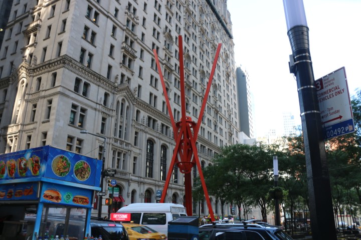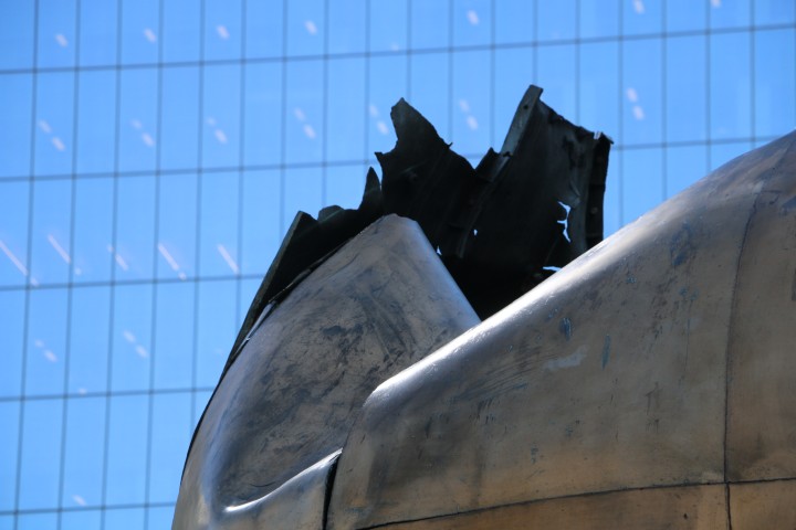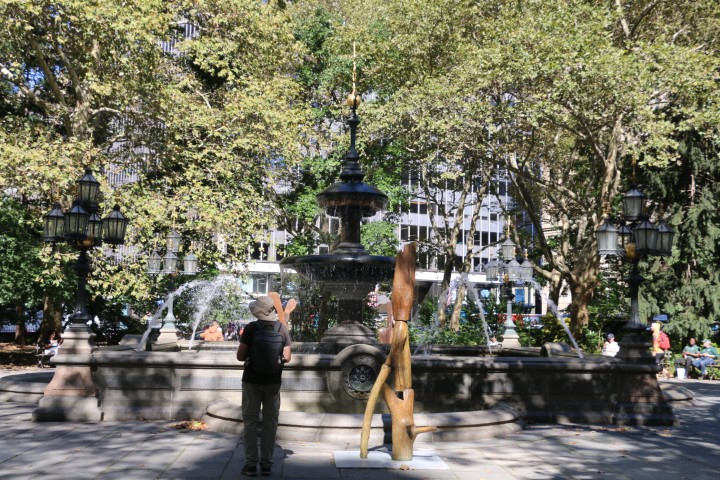Wie wir so da stehen und diskutieren, höre ich einen bekannten Zungenschlag: ja, es sind Luxemburger! Die muss ich natürlich kurz anquatschen. Danach geht es zum Memorial 9/11. Zuerst kommen wir an einer großen, beschädigten Bronzeplastik vorbei: die Große Kugelkaryatide von Fritz König, welche zwischen den Zwillingstürmen auf dem Vorplatz des WTC stand. Diese mehr als 20 Tonnen schwere Plastik konnte nach den Anschlägen, beschädigt zwar, jedoch weitgehend intakt aus den Trümmern geborgen werden. Nachdem sie erstmals im Battery Park einen Standort gefunden hatte, wurde sie 2017 wieder in unmittelbare Nähe ihres ursprünglichen Standortes versetzt.