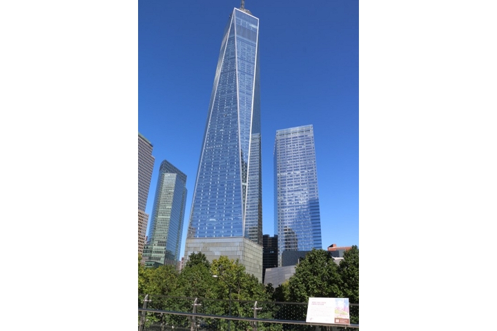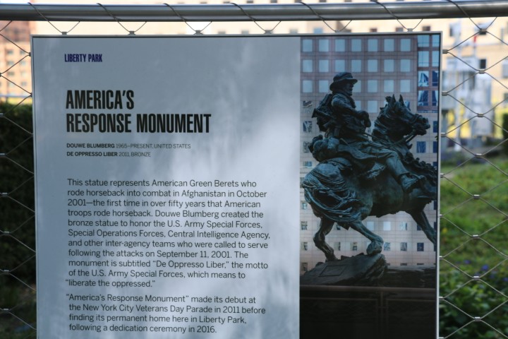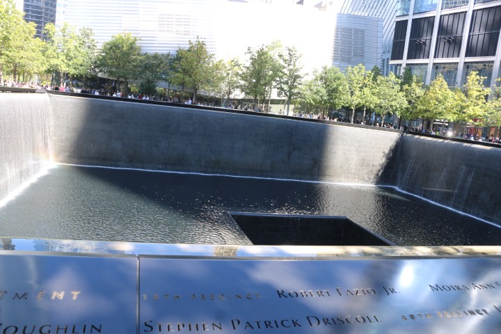 Außerdem erfahren wir (Reiter auf Pferd), dass die Amis u.a. auf Pferden in Afghanistan eingefallen sind. Dann erreichen wir die ehemaligen Standorte der Zwillingstürme. Jetzt 2 Wasserbecken, auch Reflecting Pools genannt, an deren Seiten das Wasser hinabfließt und um den Rand sind die Namen der Menschen eingearbeitet, die bei den Anschlägen 1993 und 2001, sowie der Menschen in den Flugzeugen, umgekommen sind. Dabei symbolisiert das fließende Wasser die „Reflexion der Abwesenheit“ (Reflecting Absence) und eine Leere, die durch die Anschläge entstanden ist.