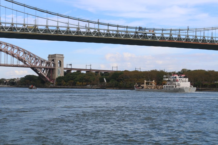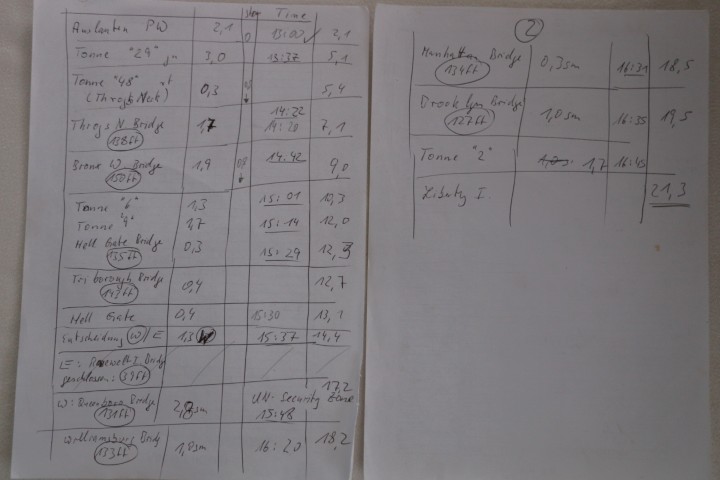 Langsam füllen sich die Felder mit den Durchgangszeiten. Und es geht gut: Fast auf die Minute! Klar – genau im Hell Gate liegt ein Arbeitsponton und klar – genau in dem Moment, als wir ankommen fährt der los – genau auf uns zu. Und hinter ihm kommt ein nicht ganz kleiner Frachter.
