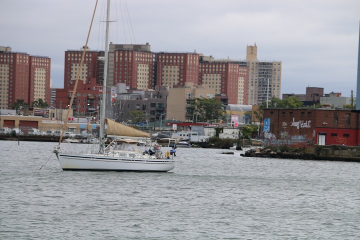 Nach 2 Stunden ein kurzer Abstecher nach links: Einmal ein Besuch der Brooklyn Marina. Anschauen, wie eng das da ist. Wäre eine Alternative, falls wir nochmal herkommen… Auf der letzten Meile flitzen dann die bekannten beiden kleineren Polizei-Boote wie die Wilden vor uns. Eins scheert aus und kommt zu uns. Begrüßung – also sie würden „Übungen“ machen. Wo wir hin wollen. Dann würden sie sich aus unserer Kurslinie raushalten. Also – ich denke, die hatten ein schlechtes Gewissen, dass jemand gesehen hat, was die für Unsinn gemacht haben….