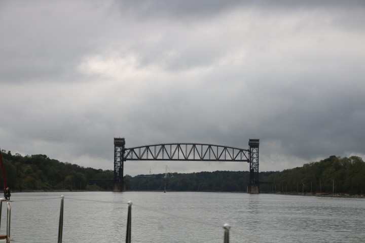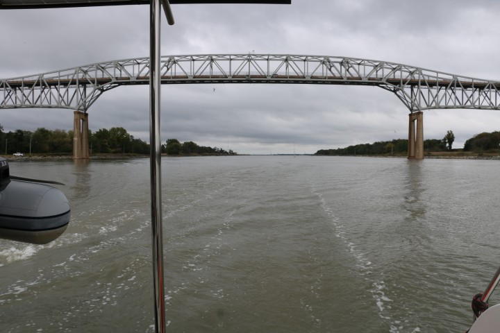 Die „kritische“ Brücke, die wir nicht passieren können, wenn sie geschlossen hat, ist offen. Der Wind weht schwach von hinten, der Strom schiebt uns kräftig. Mit Sonne wäre es ein 1a-Tag!