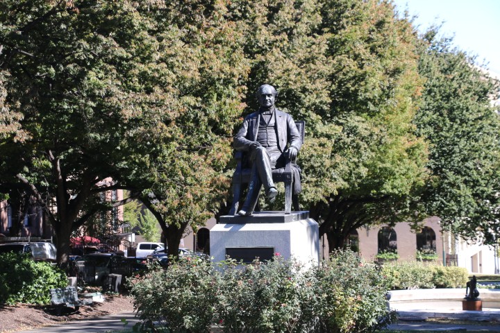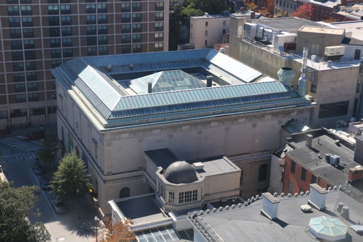 Danach gehen wir doch noch kurz am Museum vorbei, es liegt quasi auf dem Weg, um auch wirklich sicherzustellen, dass es jetzt noch geschlossen hat. Hat es. Aber direkt hinter dem Museum steht das „Washington Monument“, das erste bedeutende Denkmal zu Ehren von George Washington. Es ist ein Turm mit obendrauf einer Statue von ihm. Der Besuch unten ist umsonst – viiieeeel gibt es allerdings auch nicht zu sehen. Will man sich jedoch abmühen und die 227 Stufen bis ganz nach oben erklimmen, müssen Erwachsene 6 Dollar ablaschen. Und Senioren kriegen für diese Heldentat noch nicht mal einen Rabatt, wie sonst in Museen u.s.w. üblich! (Wahrscheinlich hoffen sie, dass diese dann vom Erklimmen der Stufen absehen, ehe sie im engen Treppenhaus wegen Herzinfarkt abgeborgen werden müssen.) Wenn sie für das Geld wenigstens einen Lift anbieten würden! Aber nee! Dem können wir natürlich nicht widerstehen und asten uns hoch. Natürlich in keinster Weise mit dem OWTC in NY zu vergleichen, aber trotzdem, nette Aussicht.