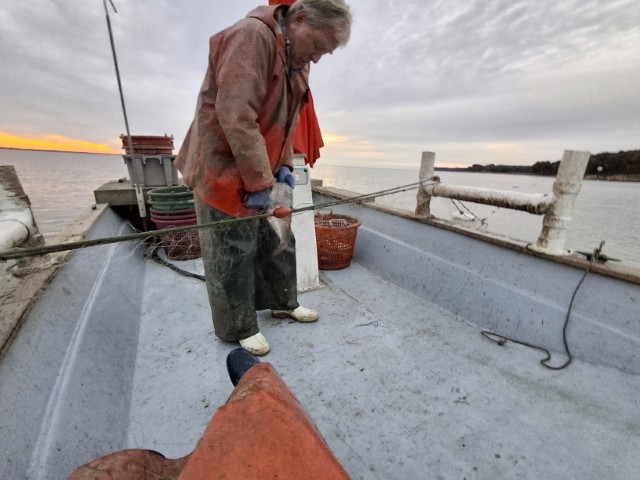 Kurz vor 7 bin ich bei ihm und werde „eingekleidet“. Eine dicke, lange Ölschürze bekomme ich und Plastik-Arbeitshandschuhe. Dann geht es los – zunächst mit seinem Netz-Boot!