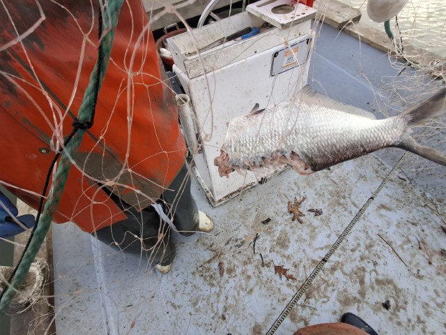 Dann kommt die letzte Schleife und wir sind auf dem Potomac. Der hier für Mike sehr schmal ist. Darf er doch nur in Virginia fischen und das hört wenige Meter nach dem Ufer auf! Das erste Netz steht gleich bei der Ausfahrt aus dem Creek. Eine Möve sitzt schon an. Die ist jeden Morgen da, erzählt Mike. Bekommt aber nicht viel ab. Und ich lerne nun, wie das mit einem Stellnetz funktioniert. Beginnend an dem einen Ende ziehen wir das Netz über die Rohre an Bord und geben es auf der anderen Seite wieder von Bord. Wo sich Fische verfangen haben, wird ein Stopp eingelegt und der Fisch wird aus dem Netz befreit. Dazu hat Mike eine Haken mit einem schönen Griff und zieht die Netzmasche dann über den Fisch. Zack – landet der im Korb. Sieht einfach aus, aber als ich dann dran bin merke ich, dass es nicht ganz so einfach ist…