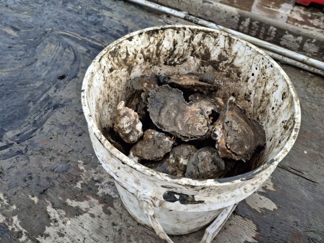 Zurück am Steg steigen wir ins Austern-Boot. Mike ist morgen eingeladen und soll da 50 Austern mitbringen. Und er möchte mir auch zeigen, wie das geht. Ist ganz einfach: Am Ende des Creeks hat Mike ein „Feld“. Überall ragen weiße Stangen aus dem Wasser. Zwischen diesen sind Leinen gespannt. Und an diesen sind dann Querleinen, die zu den Körben mit den Austern führen. Mit einer Winde holt er einen Korb raus und stellt diesen auf die Arbeitsfläche. Ca. 250 Austern liegen im Korb. Wir sammeln die 50 größten raus. Dann geht der Korb wieder ins Wasser. Und klar – danach fällt mir ein, dass ich da ja auch Fotos hätte machen müssen. Nein – noch mal rausholen, das lassen wir sein.