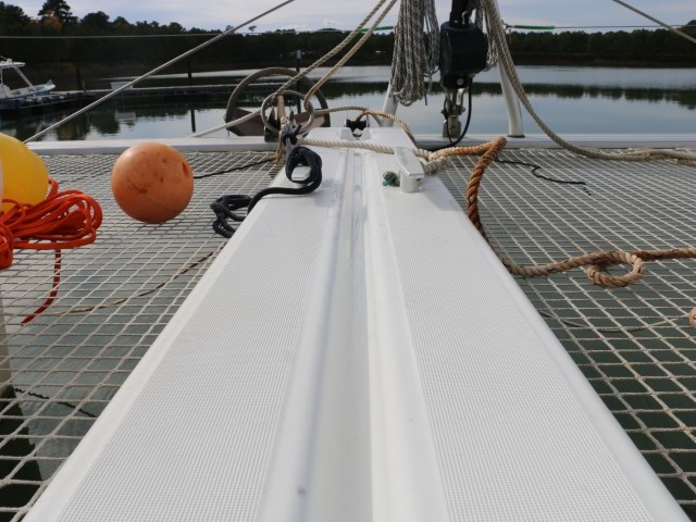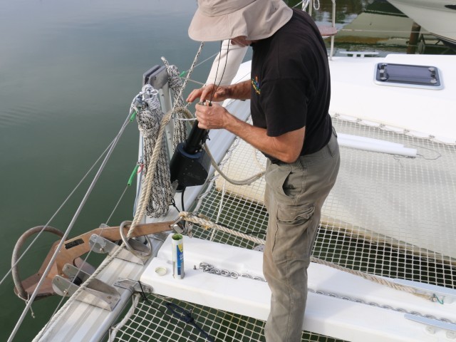 Um kurz vor 10 Uhr bin ich wieder an Bord. Und gleich in Action: Die letzen Durchgänge mit Rost putzen. Die Traverse ist ganz blank und schön weiß. Im Kettenkasten sind noch einige Flecken. Für die habe ich dann keine Lust mehr. Insgesamt sieht auch der Kettenkasten recht ordentlich aus.