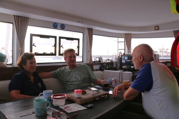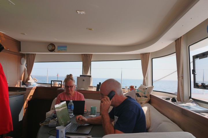 Den Nachmittag verbringen wir mit Jutta und Thomas von der JOBBER. Die wollen auch morgen ganz früh los und so sind sie froh, ihr Dinghy auf dem Vordeck lassen zu können. Denn – klar – ich hole sie gerne ab. Ist das Zuwasserlassen des Dinghys auf RE kein Problem. Nur unwesentlich mehr, als jeden Tag…
