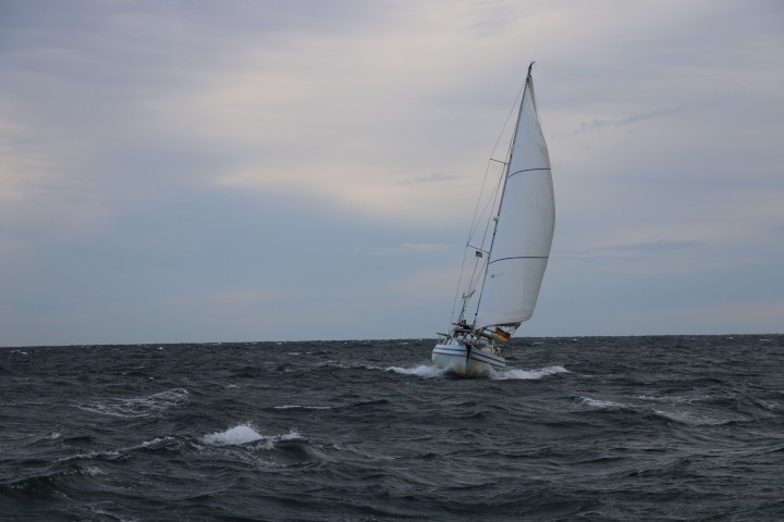 Mit diesem Antrieb haben wir sogar eine Chance gegen ein 48 ft Monohull Downwind. Und so steht dann im Logbuch: „JOBBER querab 09:15“. Eine große Fotosession ist angesagt. Von hinten, querab und dann von vorne. Thomas hat zwar Anweisung gegeben, zu warten, bis sich die Wolken verzogen haben. Aber ich finde die Bremse nicht… So gibt es den Sonnenschein erst gegen 11 Uhr.