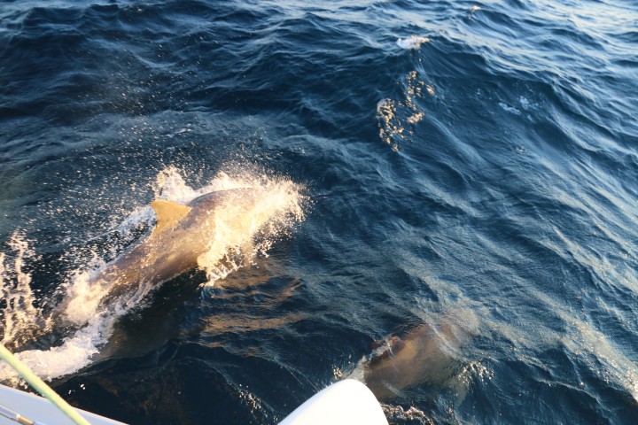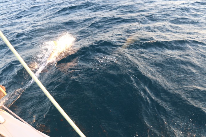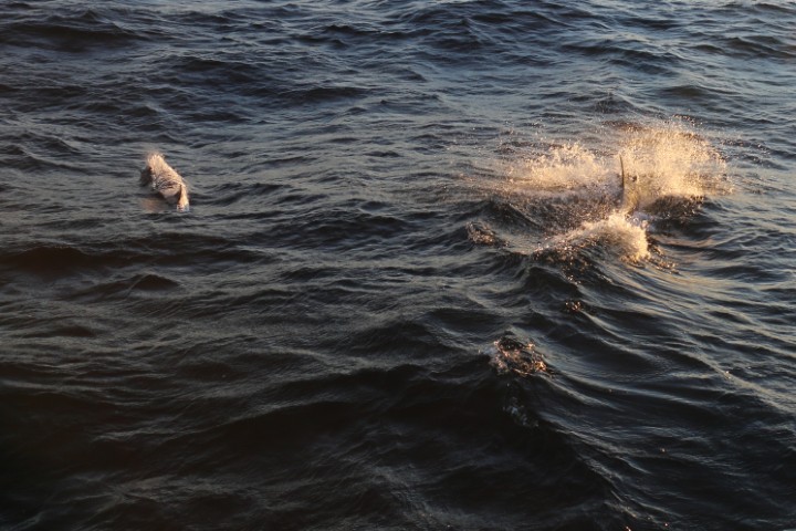 Dann – immer wieder eine große Freude für mich – Delfine! Richtig große. Beim ersten Besuch schaffe ich keine Fotos. Kaum bin ich in Position sind sie weg. Nachmittags beim zweiten Besuch dann aber eine ganze Reihe. Als ich endlich zufrieden in den Salon komme, meint Alisha: Gerade als Du nach hinten kamst, machte einer eine tollen Sprung! Sh….