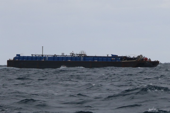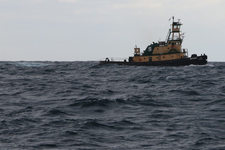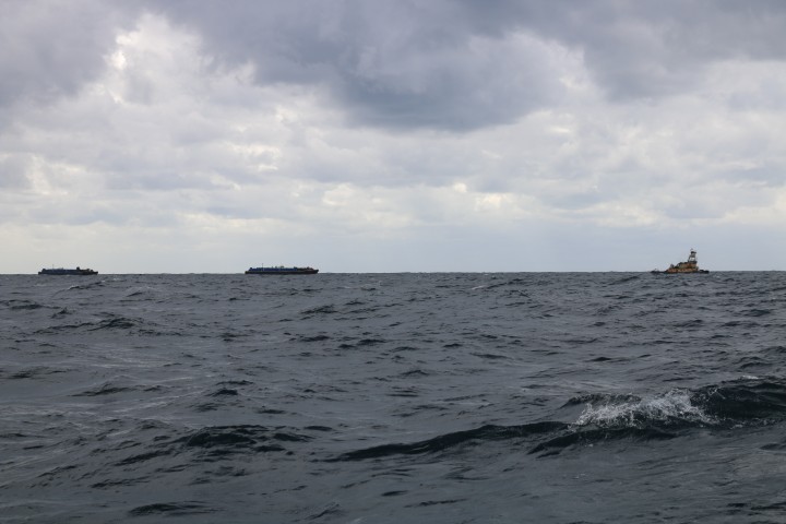 Und oben „ärgert“ uns ein Schleppverband. Kommt genau auf uns zu und sieht ulkig aus. Wir weichen dann auf 2 Meilen aus und sehen: Es ist ein Schlepper mit 2 Hulks! Siehe Bilder! Kaum ist der querab, gehen wir wieder auf unseren Kurs.