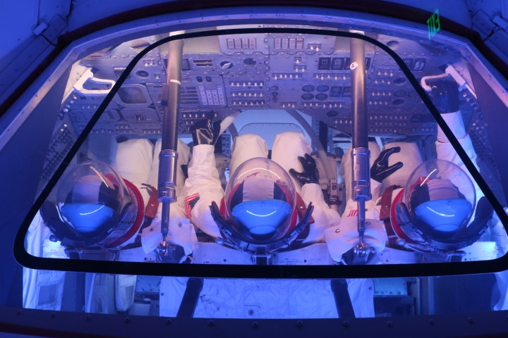 Die Tour geht weiter und führt zum Apollo-Programm. Man wandert unter einer der gewaltigen Saturn V Raketen lang. Ein Modell darunter lässt einen auch ins Innere schauen. Viele Mond-Exponate, ein sogar zum Anfassen. So dass man sagen kann: Ich hatte ein Stück vom Mond in der Hand...