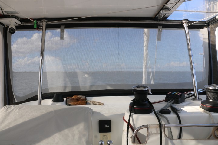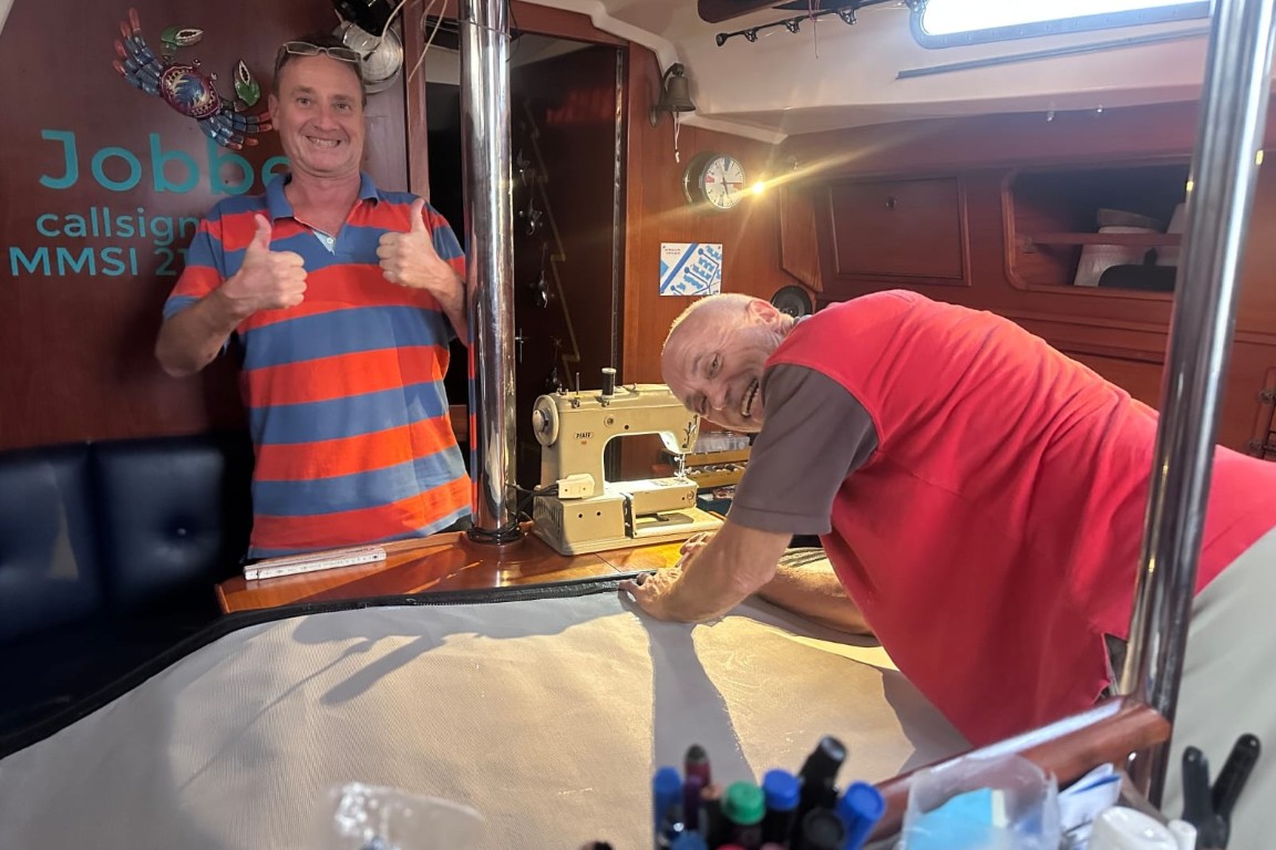 Auf der JOBBER ist heute also Nähzentrum. Und da das mit der Haube so gut geklappt hat und da Thomas fragt, ob er noch was… Also: Ja – ich habe da noch 2 Meter an der Persenning. Aber ob seine Maschine das kann? Er meint: Ja. Also hole ich die Frontscheibe und ja – es klappt! Nicht ganz einfach, aber am Ende hat die Frontscheibe auch zwei Reißverschlüsse, an denen der Sonnenschutz angebracht werden kann.