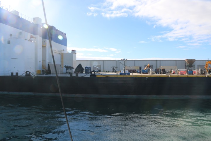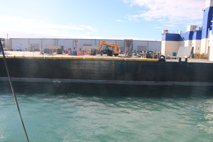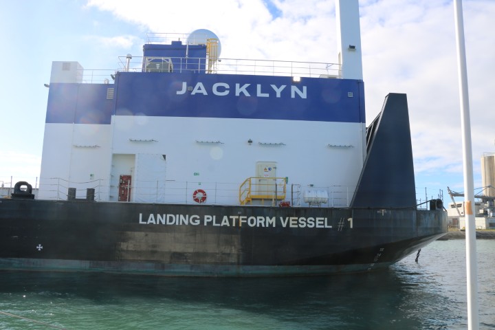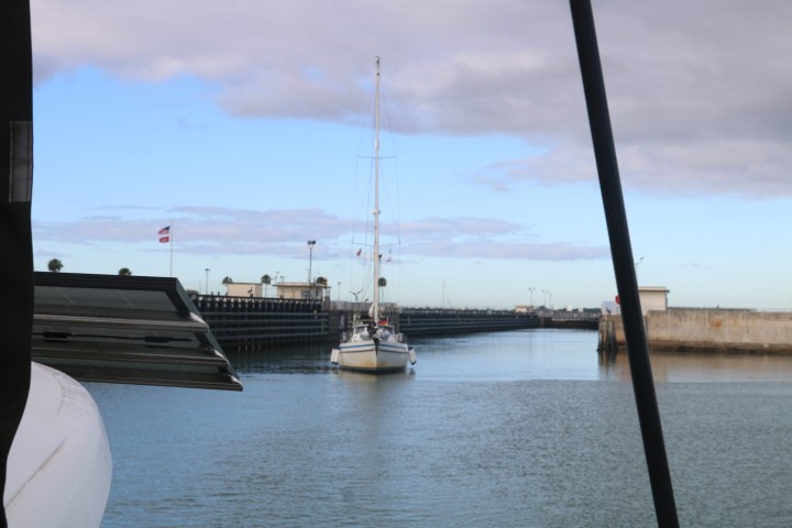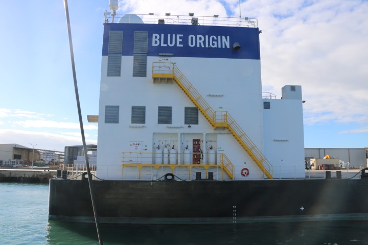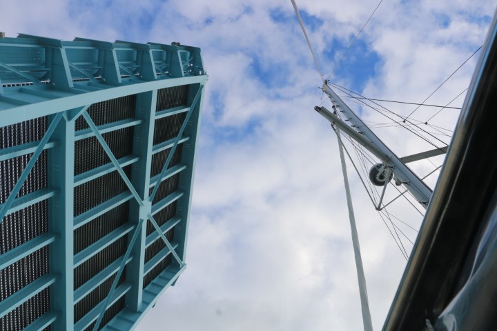 Denn nach der Schleuse kommt die Brücke. Und klar – sie macht nur einen Flügel auf. Dankenswerter Weise den Nordteil. Da kann ich an Backbord außen stehend RE auf ca. 2 Fuß von der Mauer entlang steuern. Im Hafen fährt RE alleine und ich flitze rum, sammle die Fender und Leinen ein. Dann die Fender verstauen, den Anker hochseeklar machen und die Schoten klar legen. Nebenbei fahren wir an 2 Falcon9 erste Stufe vorbei. Und an einem neuen Landeschiff von Blue Origin. Die wollen Elon Musk mit seiner Falcon9 Konkurrenz machen. Aber der landet inzwischen ja wieder am Startplatz. Ist also schon wieder einen Schritt weiter!