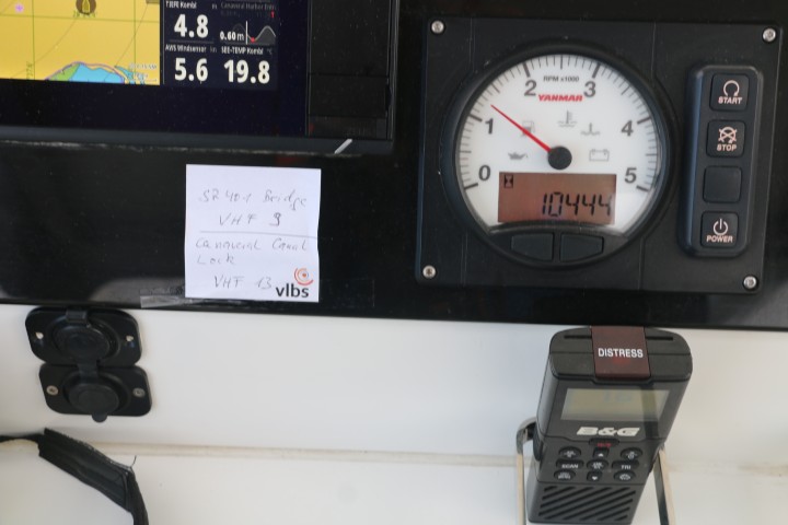 Wir hatten uns auf ein gemütliches Aufbrechen verabredet. Ich nehme ab 8 Uhr meinen Anker auf. Sollte mit dem Reiter (25 kg Blei an einem großen Ring) bergen etwas nicht funktionieren, dann kommt mir einer der JOBBER zur Hilfe. Aber es klappt alles wunderbar. So kann ich signalisieren: Bin fertig zum! Die JOBBER hievt Anker, ich melde uns bei der Schleuse an und los geht es!