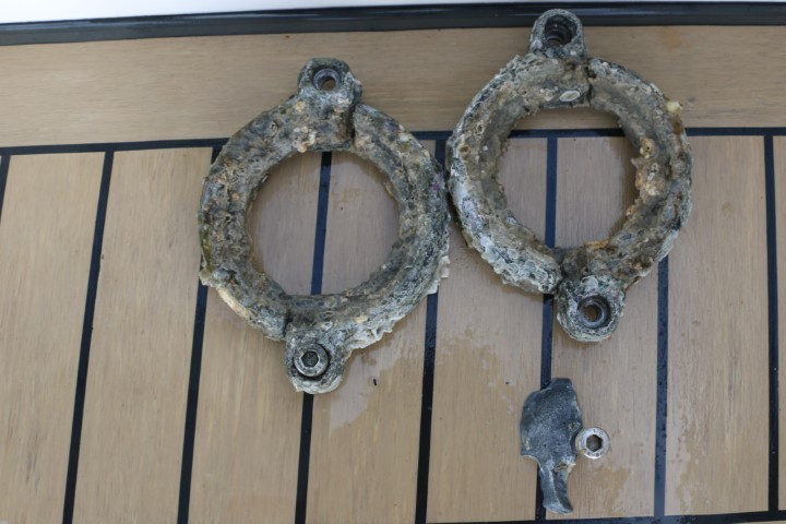 Nach Essensvorbereitung springe ich dann ins Wasser. Nein – nicht zum Vergnügen, die Opferanoden der SailDrives (Z-Getriebe) und besonders der Faltpropeller müssen erneuert werden. Und das war dann wirklich wichtig! Siehe Bilder der alten Opferanoden….