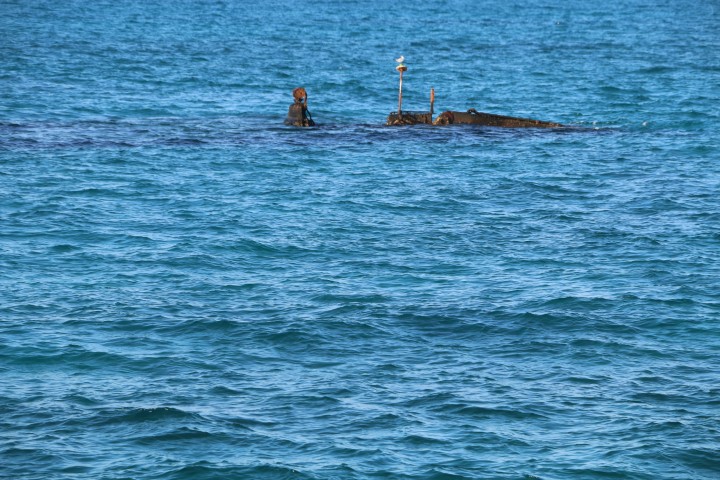 Kurz vor der Nordspitze der Insel ein Wrack, das ein wenig aus dem Wasser schaut. Leider haben wir zu wenig Zeit, als dass wir spontan ins Wasser springen und es beschnorcheln.