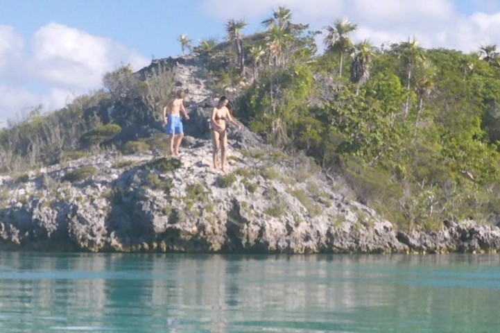 Kurz nach 13 Uhr erreichen wir unser Ziel für den heutigen Tag. Wir gehen in der Bucht vor dem „Exuma Cays Land and Sea Park“ vor Anker und machen uns mit dem Dinghi auf den Weg durch die Mangroven. Das Wasser ist beeindruckend klar und eine Schildkröte taucht vor uns ab. Da werden wir auf dem Rückweg wohl noch ein bisschen genauer aufpassen und die Kamera bereithalten müssen. Als wir dann die Washing Maschine erreichen verschlägt es Carlos und mir die Sprache. Es ist ein wahres Paradies! Ich hätte nie geglaubt, dass es solche Strände tatsächlich gibt. Palmen, glasklares Wasser über weißen Stränden, die sich bis zum Horizont erstrecken und wenig Menschen. Chrischan braucht Geduld mit Carlos und mir, denn wir wollen am liebsten bleiben. Wir toben bestimmt 1h im Wasser rum und hüpfen mehrfach von den Felsen in die Strömung. Wir können uns dann auch nur losreißen, weil wir auf dem Rückweg durch die Mangroven noch Schildkröten fotografieren wollen.