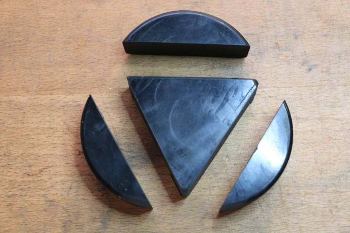 Und so mache ich eine Schablone. Und zersäge den einen Puck. Ich will (min.) 3 Ecken im Dach des Steuerstandes so verschließen, dass der Regen nicht rein fließt! Und das tut er bei stärkerem Regenfall. Dass ich die drei aus einem sägen kann, hatte ich vorher nicht berechnet. So bleibt ein Puck (noch?) ganz.