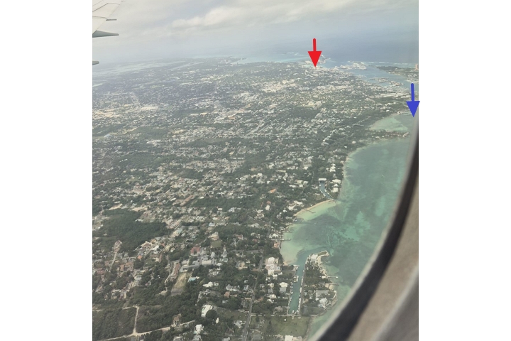 Luftaufnahme beim Landeanflug von Claudia: ROT aktueller Ankerplatz (im Westen), BLAU Ankerplatz im Osten