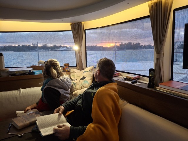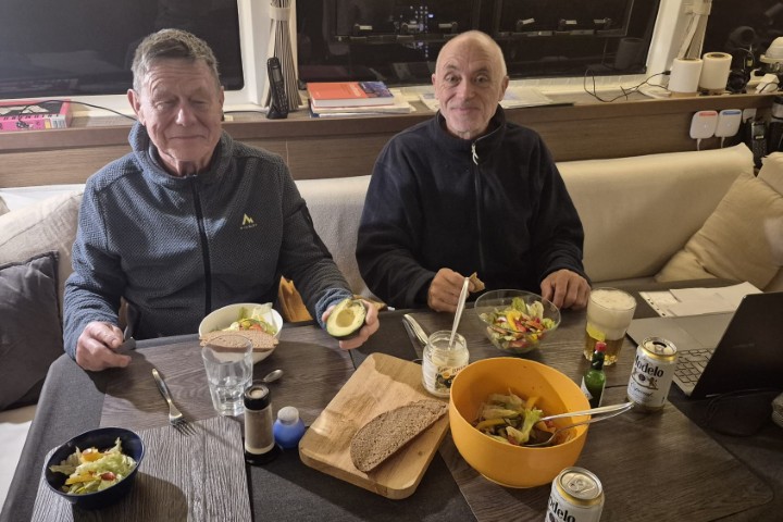 Friedrich verschwand irgendwann, Claudia leistete mir Beistand. Bald nach 1 Uhr bedankte ich mich und auch sie fand den Weg in die Koje. Ich wartete noch ein wenig. Kurz nach 2 Uhr machte ich mich bettfertig, noch eine Oberdecksrunde. Ordentliche Böen, also über 35 kn. Aber RE lag auf dem Fleck und auch die Ankerlieger um uns herum lagen stabil. Gute Nacht!