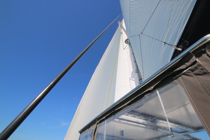 Im Hafen selbst fährt RE ja selbstständig. So kann ich die Fender und Leinen verstauen und das Vorschiff hochsee-klar machen. Kurz nach 12 Uhr sind wir dann „draußen“. Eine sanfte Dünung empfängt uns. Und ein netter Wind. Gerade gut genug zum Segeln. Und als ich dann auf Nordkurs eindrehen kann, auch gut für die Doppelfock.