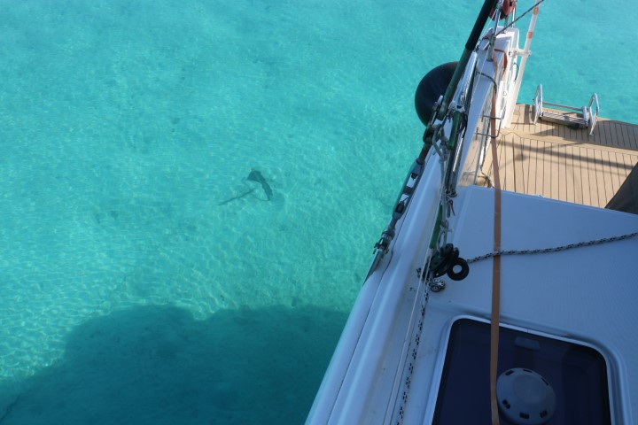 Der Blick aus dem Badezimmer ist ungewöhnlich: Ich sehe die Ankerkette auf dem Grund am Boot längs laufen! Und an Oberdeck dann fällt der Blick steuerbord achtern auf den Anker. Ja – es ist so gut wie windstill. Entspricht der Vorhersage, bringt uns dann aber nicht nach Osten – unserem Ziel, den Turks, näher! So beschließt Peter, sein Spi-Fall zu klarieren. Dazu muss er in den Mast. Am Ende zweimal. Und ich soll ihn sichern und bewegen. Mach ich doch gerne. Zum Abschluss gibt es dann frische Waffeln. Und dann eine kleine Pause. Bis zum Seemannssonntag auf RE.