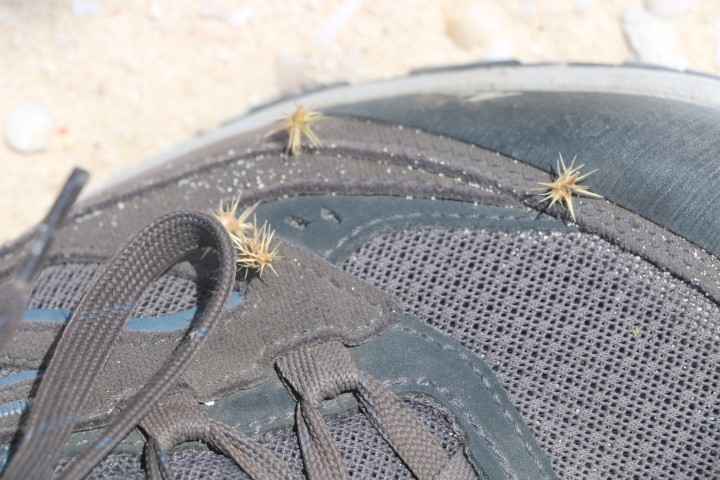Als erstes tritt man in feine Stachel-Sterne. Nico stand dann still und beschloss, nur noch auf Sand zu laufen. Und ich kann berichten: Die „kleben“ nicht nur an Schuhen und Socken, auch auf blanker Haut begleiten sie den Insel-Wanderer gerne.