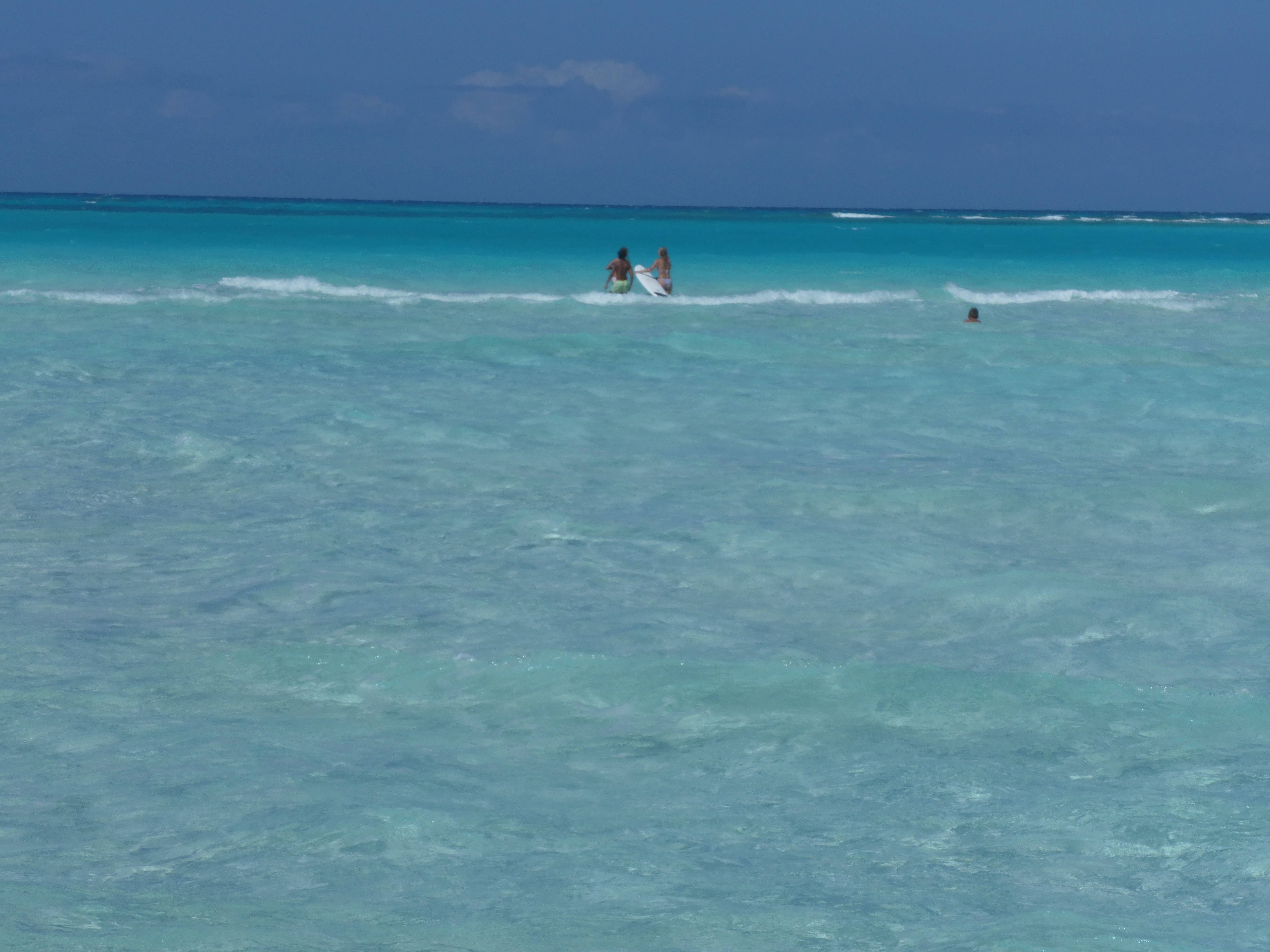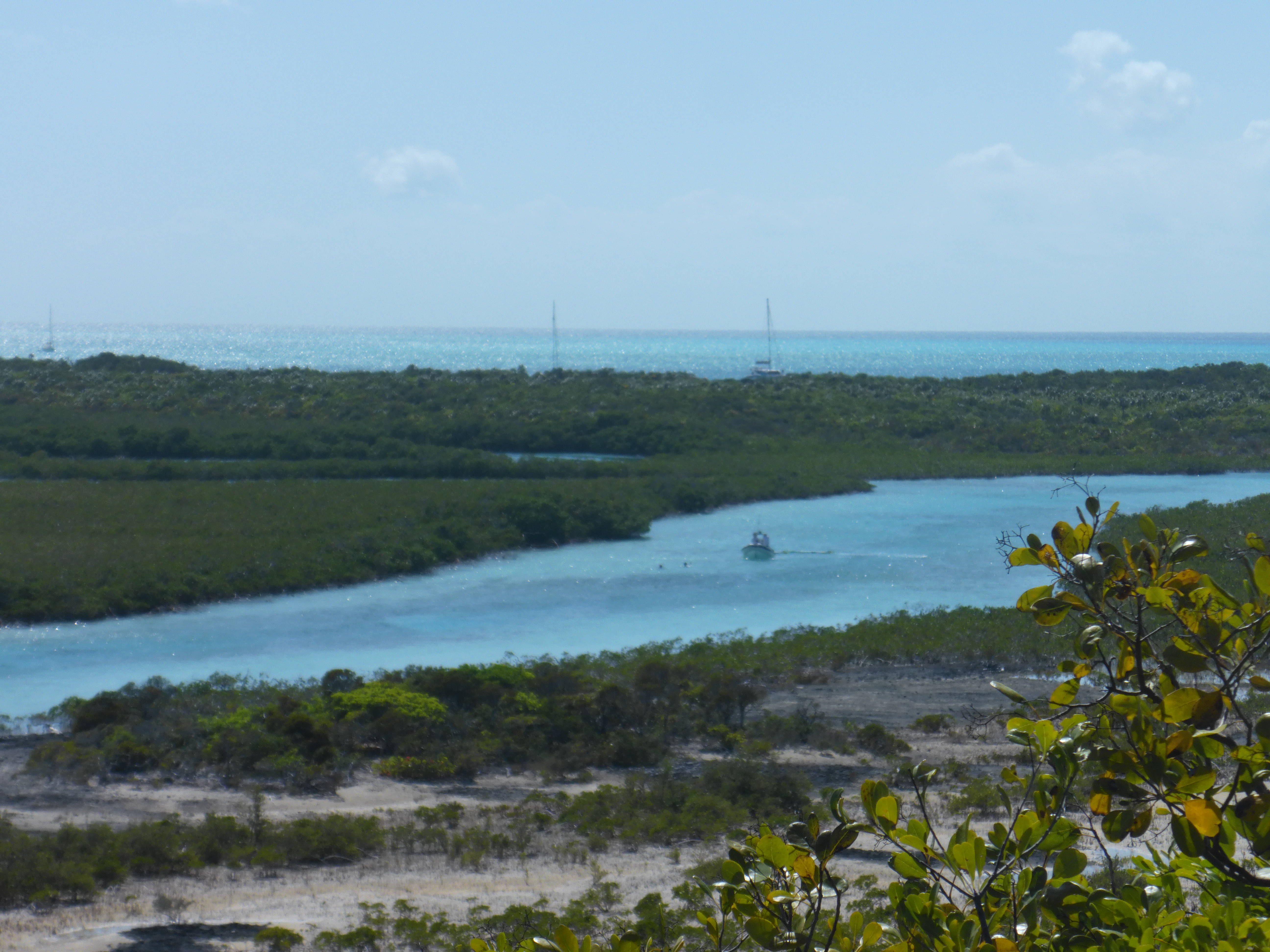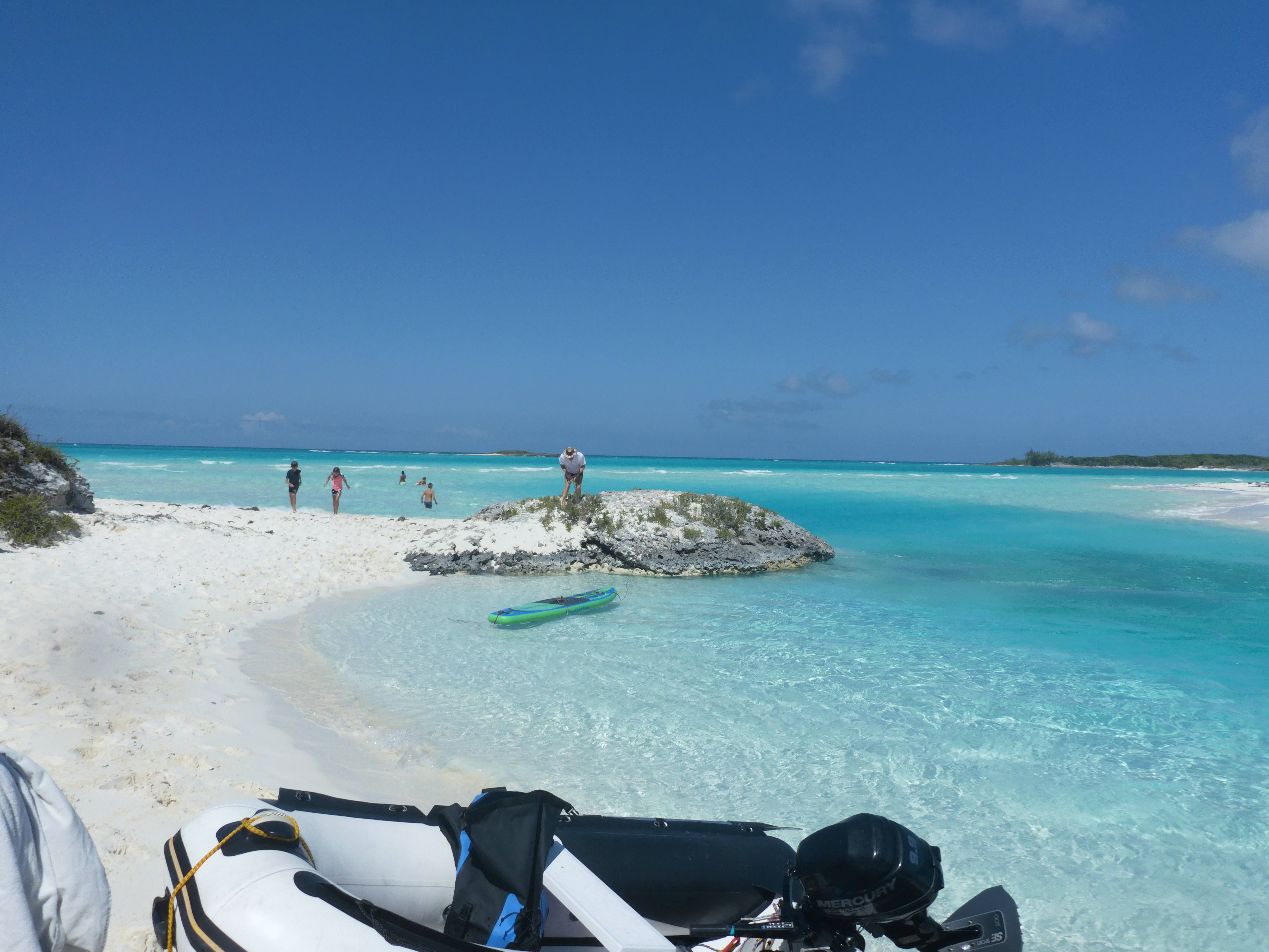 Am Ziel sehen wie den Atlantik auf der anderen Inselseite. Camp Driftwood ist der – kaum 15 Meter hohe – Hügel gleich neben dem Einschnitt in die Insel. Da hat die US DEA in den 80er Jahren einen Beobachtungsposten zur benachbarten Insel, auf der ein bekannter Drogenbaron seine Geschäfte tätigte. Und die Wash-Machine? Ist hier der Einschnitt. Kräftige Strömung an der Engstelle wird dazu genutzt, sich einmal (oder auch öfter) durchziehen zu lassen. Wir sind bei auflaufendem Wasser da und springen auf der Atlantikseite rein und lassen uns rein ziehen…