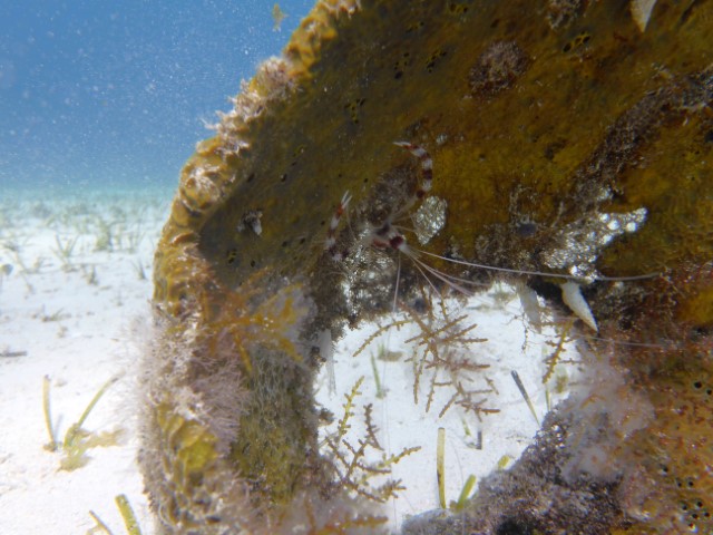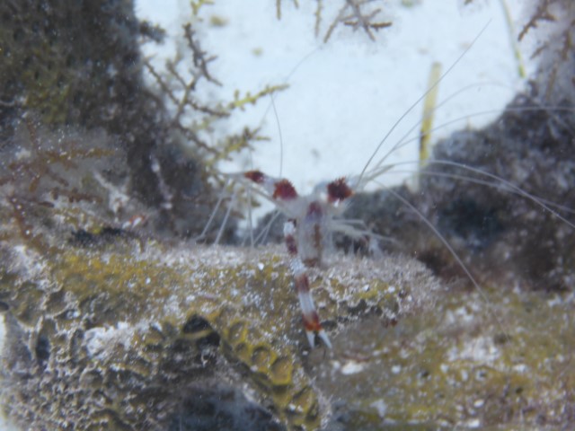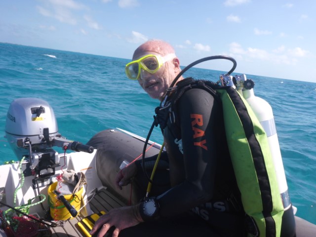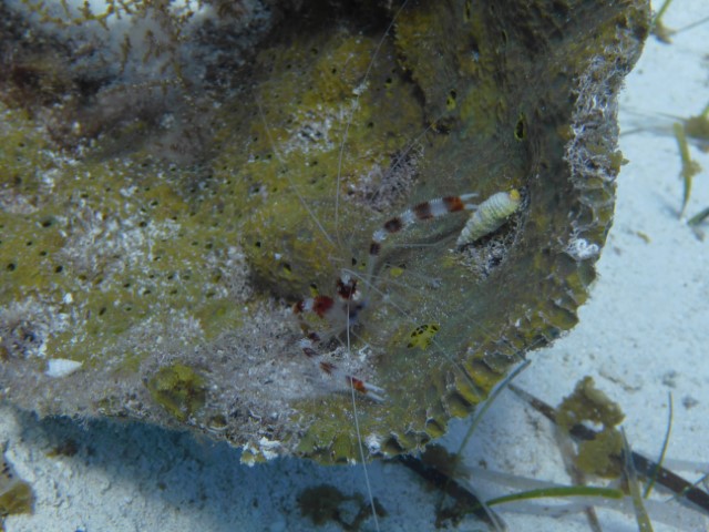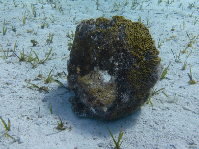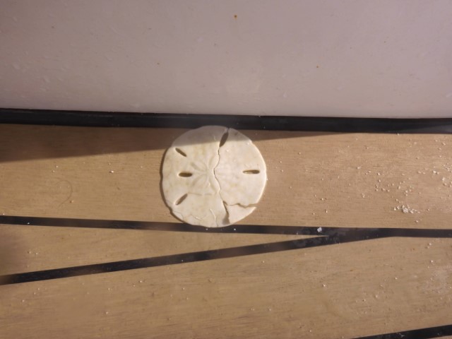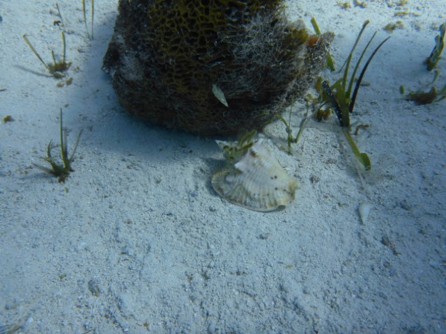 Der Tauchspot ist nicht gut bezeichnet. Und überhaupt. Es wird ein Strömungstauchgang. Heißt: Wir werden ins Wasser springen und uns von der Strömung treiben lassen. Das bedingt dann gleichzeitig, dass einer im Dinghy bleibt und der Taucherboje folgt. Nach der Beschreibung soll es bis auf 11 Meter gehen. Laut GPS sind wir genau auf der Stelle, aber wir finden nur 4,8 bis 6 Meter Wassertiefe vor. Am Anfang gehe ich mit Nathalie auf Kurs. Wir versuchen den „Abgrund“ zu finden. Doch ergebnislos. Dann konzentrieren uns auf Kleinigkeiten. Blau-durchsichtige Fischlein der 3 – 10 Zentimeterkategorie verschwinden vor uns. Dann kapiere ich endlich: Die haben keine Höhlen und schießen auch nicht so weit weg. Nein: Sie tauchen in den Boden ein. An bestimmten Stellen haben sie neben einer winzigen Koralle den Boden so gelockert, dass sie da einfach untertauchen können. Zack – weg sind sie. Das werde ich dann filmen, wenn ich mit Anna unterwegs sind. Mit Nathalie finde ich einige Sand-Dollars. Leider gehen von den dreien in meiner Hand beim Auftauchen schon zwei kaputt. Nathalie hat 5. Davon gehen dann aber 3 kaputt, als sie sie ins Dinghy legt. Und von den verbleibenden dreien tritt sie dann auf RE in zwei weitere. Ach – ich hätte doch so gerne einen schönen, großen Sand-Dollar! Nun bleibt mir nur noch ein kleiner, noch gar nicht „fertiger“.