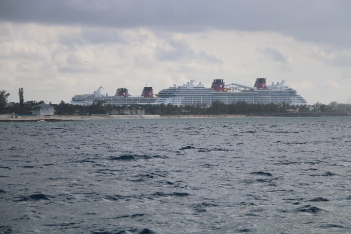 Das Einlaufen in den westlichen Teil Nassau gestaltet sich schwierig. JUNE und RE müssen warten, dass ein Kreuzfahrer ausläuft. Dann sollen wir schnell hinein schlüpfen, denn der nächste Kreuzfahrer will bald los! Klappt, ich tuckere hinter JUNE her. Doch im inneren Teil des Hafens, wo VITAMIN SEA noch einen erträglichen Ankerplatz gefunden hat, ist für uns beide nur wenig Platz. Ich versuche es, aber hier setzt Strom gegen Wind und RE segelt ständig um den Anker herum. Das sehe ich gut an der kleinen Anker-Boje. Mal steht sie rechts, dann links, dann wieder vorn. Dann ist sie weg. Ich schaue zwischen die Rümpfe: Auch nicht! Nein – jetzt ist sie sogar hinter RE! Und da der Abstand zu den anderen Booten gerade mal 50 Meter beträgt, beschließe ich in den äußeren Hafen zu gehen. JUNE ist da angekommen und meldet: Ordentlich Platz, ordentliche Verhältnisse!