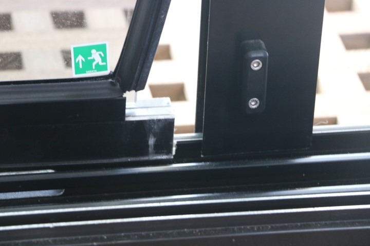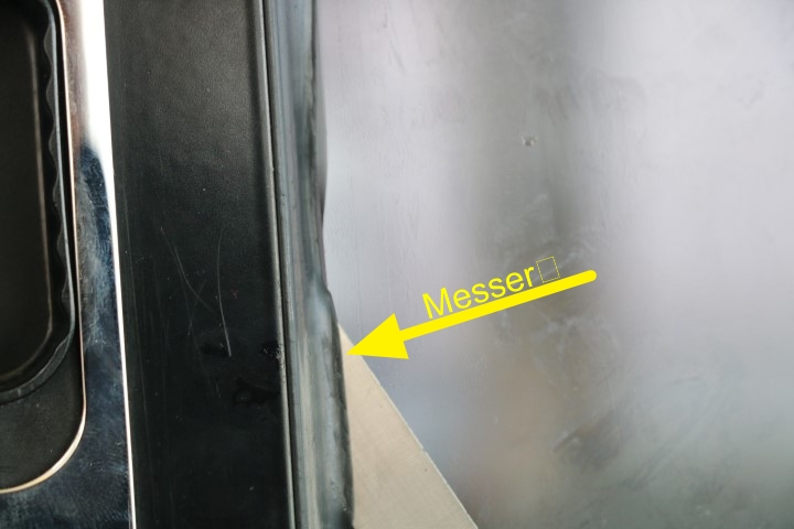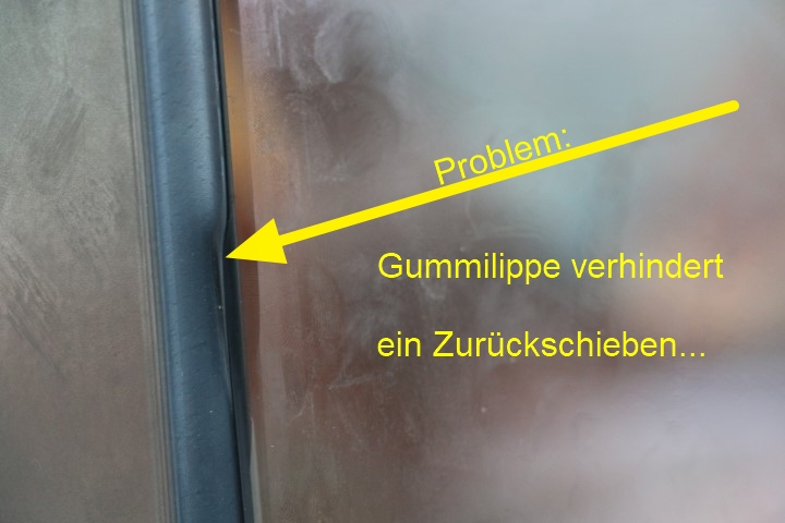 Dann endlich geht es ans Tür reparieren. 2 T-Shirts schwitze ich durch. 31° innen, über 34° außen. Die Schwierigkeit ist schnell entdeckt: Das Dichtgummi der Glasscheibe verhindert, dass ich sie einfach wieder zurück schieben kann. So muss ich mit einem schmalen Messerchen Zentimeter für Zentimeter das Dichtgummi auf die Scheibe heben und kann die dann wieder ein Stückchen rein schieben. Geduldsarbeit. Doch am Ende sitzt die Scheibe wieder im Rahmen und der ist geschlossen. Zur Sicherung bohre ich ein Löchlein, schneide ein Gewinde und platziere eine Sicherungsschraube. An dieser Stelle wird der Rahmen nicht wieder aufgehen!