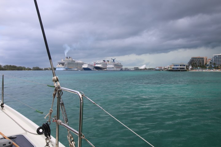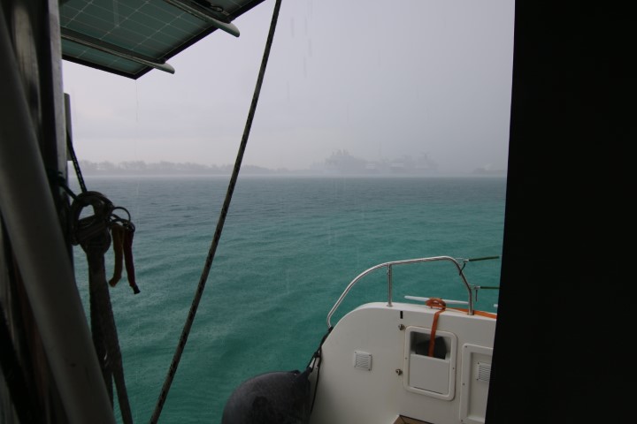 Ich beobachte die Situation noch ein wenig im Steuerstand. Dann im Salon. Nein – jetzt hält der Anker. (Gut – den ersten Reiter habe ich mit aufgesetzt. Es wird dann 5 Uhr bis ich zum Schlafen komme. Tagsüber sehe ich dann, dass ich nicht weit genug von der Tonne weg bin. Dieses Mal kein Risiko: Umankern. Da noch ein Gewitter über Nassau zieht dauert das fast 3 Stunden. Aber dieses Gewitter ist „nett“: Hält sich min. 1 Kilometer von RE weg! Aber wieder stehe ich im Standby und beobachte es. Dann ist klar: Vorbei!