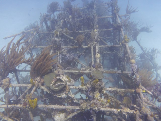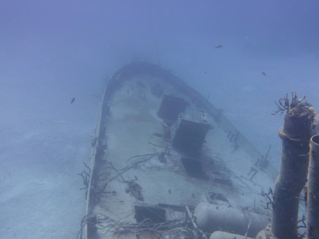 Morgens wird erst mal der Brot-Teig von gestern geformt und zur Gare gelegt. Die Zeit geht es dann mit dem Dinghy von KISS auf Schnorchel-Erkundungstour. Ja – hier wollen wir heute Nachmittag dann mal mit Gerät hin! Ein Rohrgestell identifiziere ich als Korallen-Anzucht-Station. Den B2-Bomber von „James Bond“, der zwei Atombomben entführt hat, erkenne ich in dem Gestell nicht wieder… Aber die beiden Wracks sind eindeutig. Auch Hinterlassenschaften von 007!